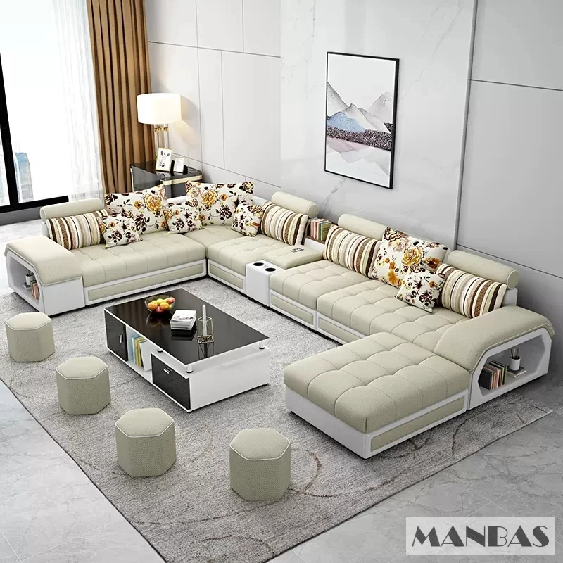 مجموعة أريكة قماشية مبطنة مع USB و مقاعد ، أثاث غرفة المعيشة ، قماش كبير على شكل حرف U ، أرائك أريكة للمنزل